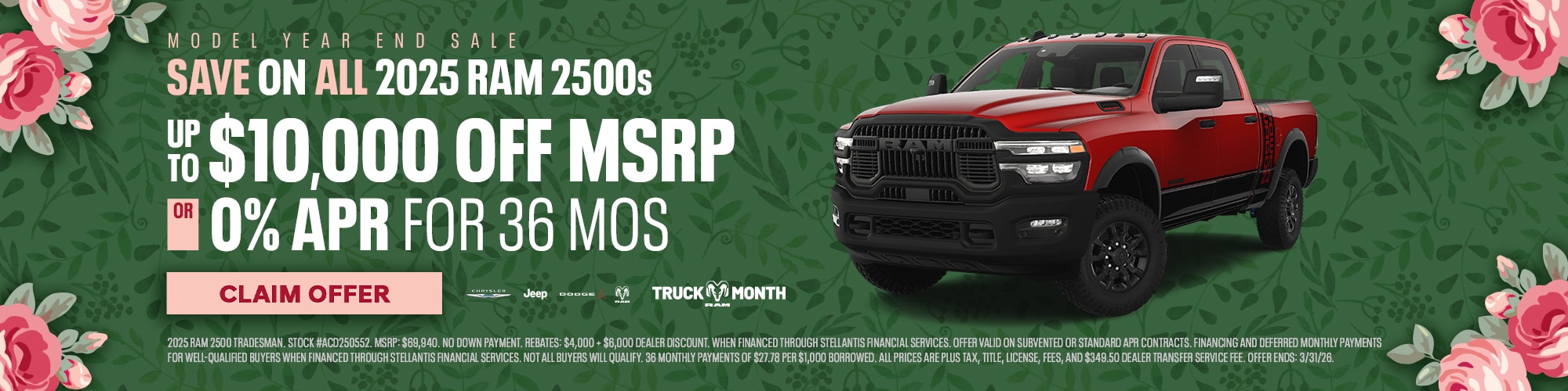 The first thing you will notice about the RAM 2500 is just how exceedingly stylish it is. That's why the RAM 2500 is constantly the top choice over similar models. Once you are behind the wheel, you'll be exceptionally delighted to have world-class safety and entertainment options at your fingertips. When searching for your family's next vehicle, this is assuredly to be one to consider. Let us help you find the best incentives and APR offers.